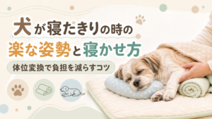 体位変換は床ずれ予防の基本です。長時間同じ姿勢が続かないようにし、愛犬の体に負担をかけないよう、ゆっくり向きを変えていきます。仰向けに近い姿勢だけでなく、左右の横向きも含めて無理のない範囲で体勢を変えると、同じ部位への圧が集中しにくくなります。褥瘡ができている場合や、体を動かすと強く痛がる場合は自己判断で続けず、獣医師に相談してください。